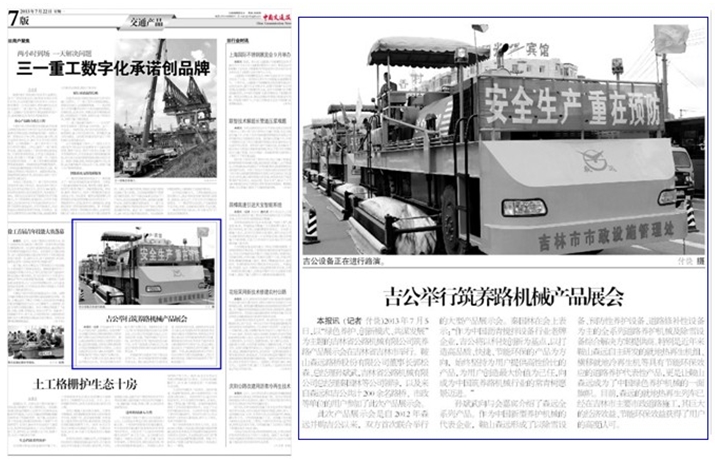 展示會得到諸多網(wǎng)絡媒體紛紛報道的同時,主流媒體平臺《中國交通報》也于2013年7月22日第七版對此次展會進行了報道,高度肯定了森遠、吉公在綠色筑養(yǎng)路行業(yè)新發(fā)展形勢下的旗幟作用,充分見證了森遠、吉公以諸多代表性產(chǎn)品服務市政道路建設、贏得行業(yè)市場、獲得用戶認可的不爭事實。